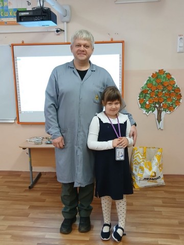 17 октября 2025 года, в преддверии Дня отца, ученики начальной школы изготовили открытки для пап и затем вручили их. С беседой в 1 "А" класс пришёл папа ученицы Анны Кокиной, Александр Александрович, монтажник радиоэлектронной аппаратуры, а в 3 «Б» класс - Вадим Владимирович, папа ученицы Катюши Сучковой. Вадим Владимирович работает инженером по водоочистке. Папы рассказали о своих важных и нужных профессиях