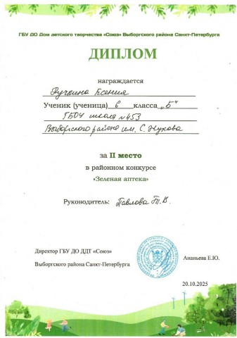 20 октября 2025 года в ДДТ «Союз» Выборгского района состоялся открытый районный конкурс на лучший гербарий «Зелёная аптека». Участие в этом конкурсе — это хорошая возможность исследования природы, открытия целебных тайн растений. Наша ученица 6 «Б» класса, Ручкина Ксения, заняла в этом конкурсе 2 место.