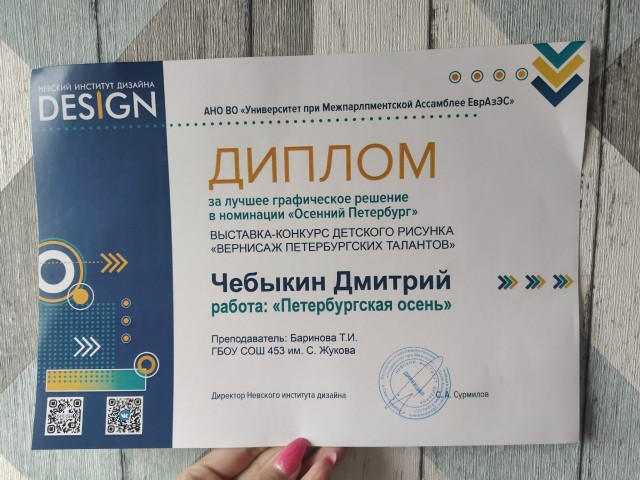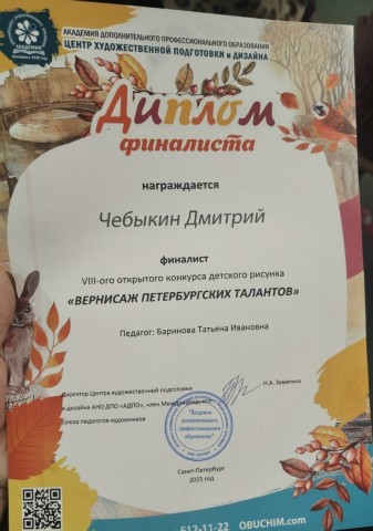 17 ноября 2025 года состоялась торжественная церемония награждения финалистов и победителей городского конкурса «Вернисаж петербургских талантов».Работа нашего ученика, Чебыкина Дмитрия из 4 «Б» класса, была высоко оценена профессиональным жюри и получила специальную награду от Невского института дизайна (АНО ВО "Университет при Межпарламентской Ассамблее ЕврАзЭС") как «Лучшее графическое решение"