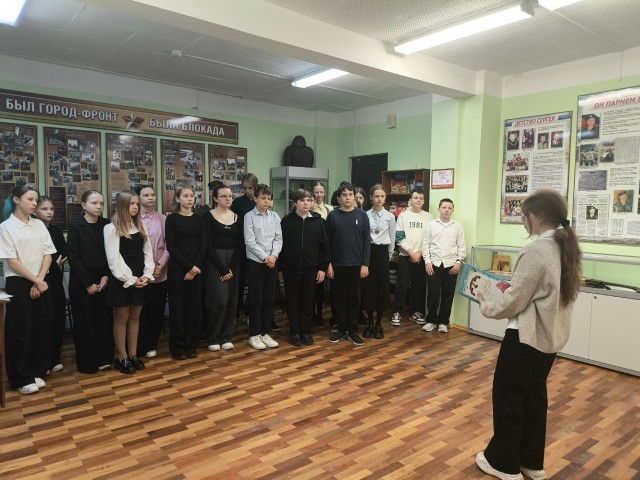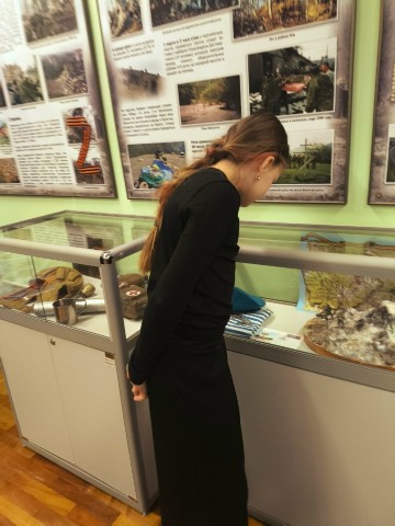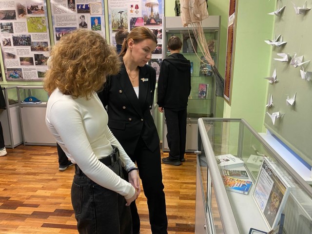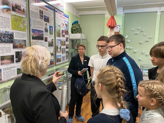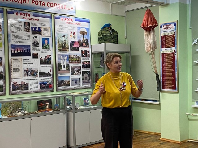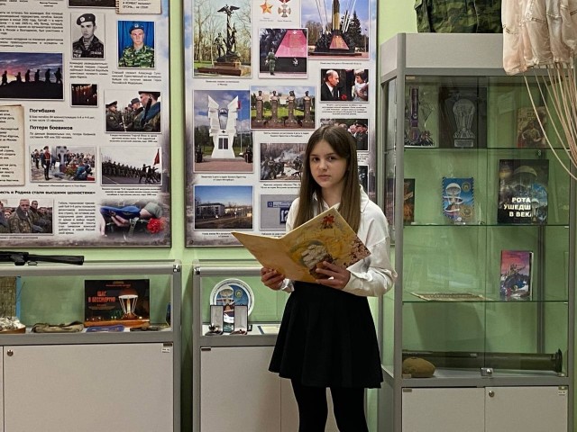 Затем всех гостей ждала экскурсия по школьному музею «Защитники Отечества», посвящённая подвигу 6-ой роты псковских десантников. Экскурсию провели наши юные экскурсоводы, ученицы 7А класса Филатова Камилла и Козлова Анастасия, которые с глубоким уважением и знанием рассказали о подвиге 6-ой роты ВДВ.
