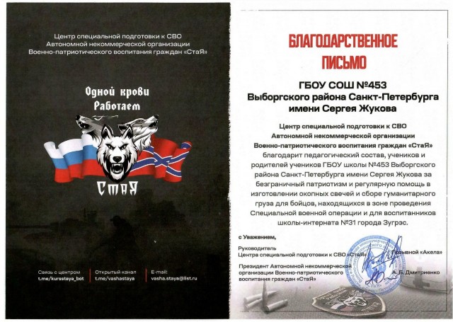 Патриотическая организация «СтаЯ» выразила благодарность нашей школе за регулярную гуманитарную помощь фронту и мирному населению Донбасса.